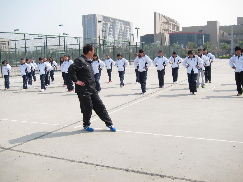 4月8日10点,体育部副教授赵天益老师已经在田径场组织学生集合整队,紧接着开始带领学生进行热身活动。站在一旁观看学习的是体育部几名青年教师,这是体育部针对青年教师课堂教学能力培养而开展的示范课活动。