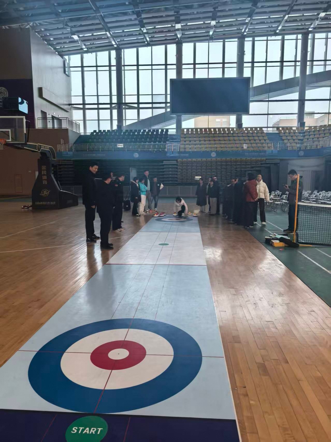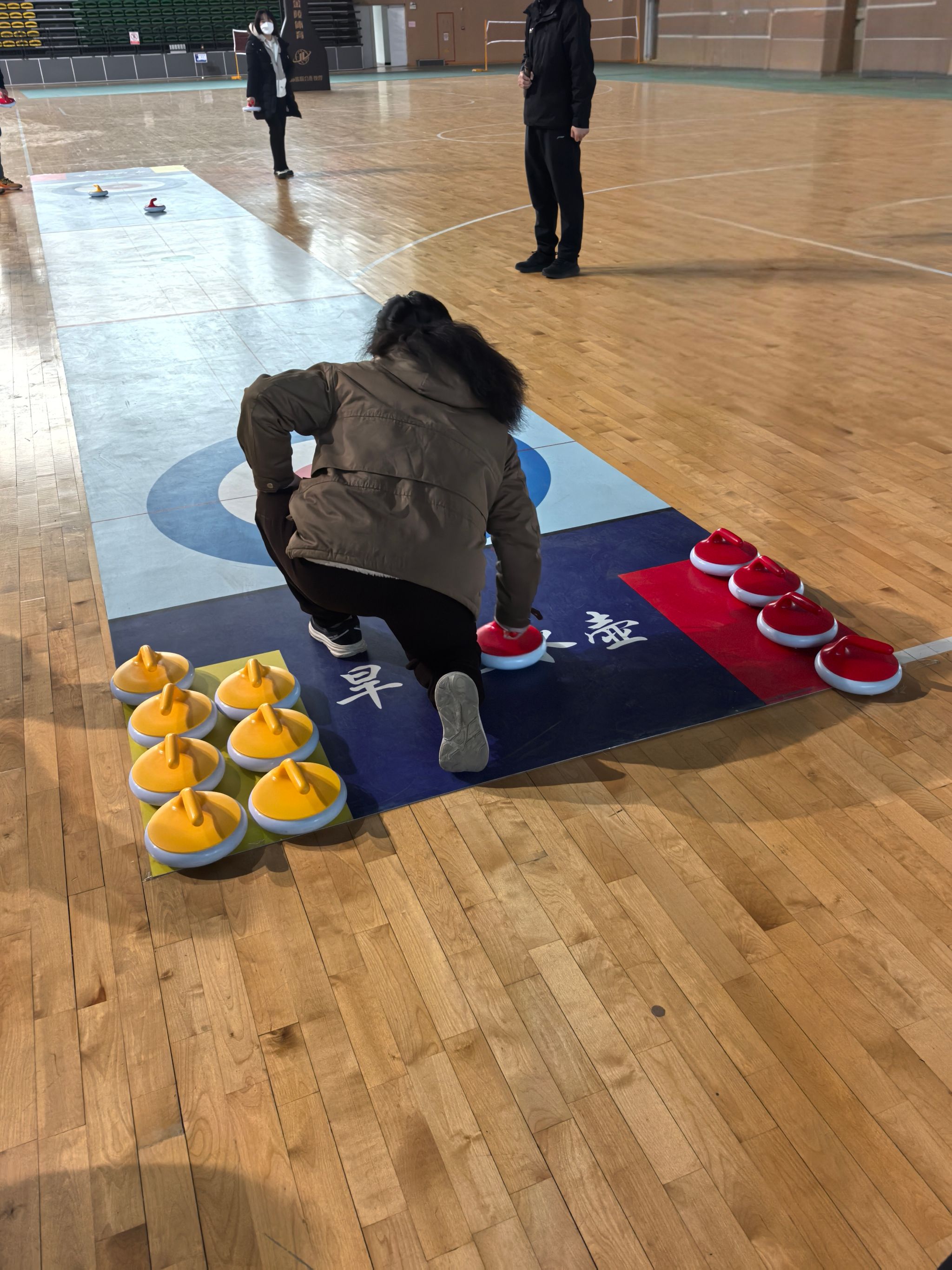 紧接着由郭奇奇老师围绕“探秘冰上国际象棋”,开展陆地冰壶理论知识讲解,让大家了解了陆地冰壶的运动装备、赛道区域、战术应用及竞赛规则,并为大家示范了投壶的准备姿势、推壶的手法、掷壶的要领,在随后的实践环节,教师分组亲身体验投壶过程,初步感受技术运用与战术配合,郭老师针对教师们的动作进行一对一指导,及时纠正不规范的姿势。教职工们学习热情高涨,体验到了冰壶魅力。