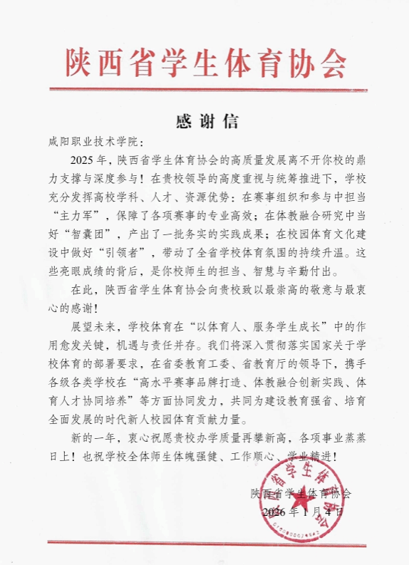 近日,陕西省学生体育协会发来感谢信,对咸阳职业技术学院2025年在全省校园体育工作中的突出贡献给予高度认可。