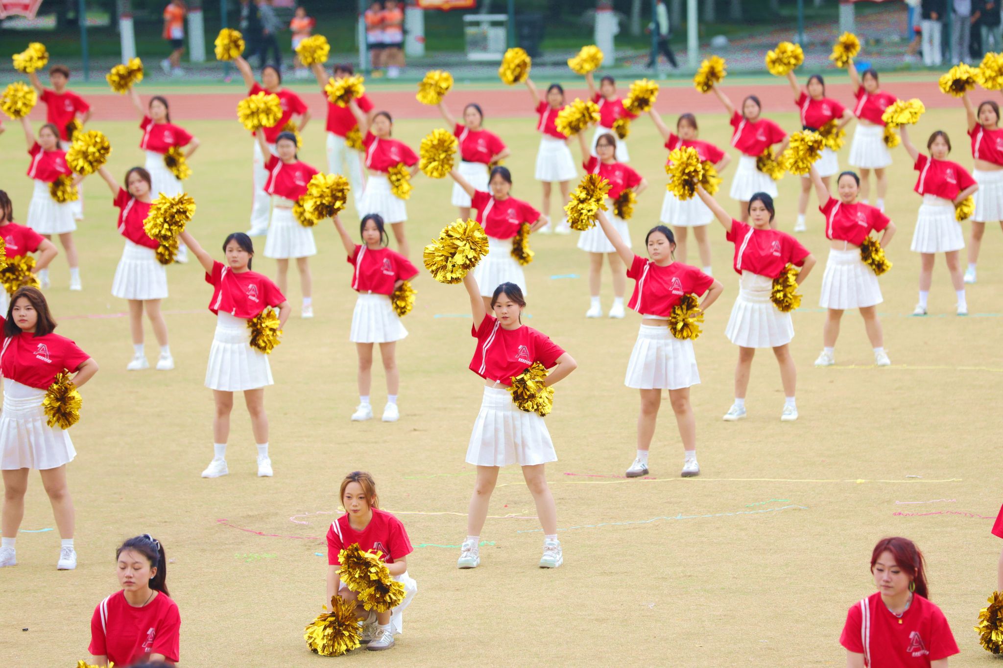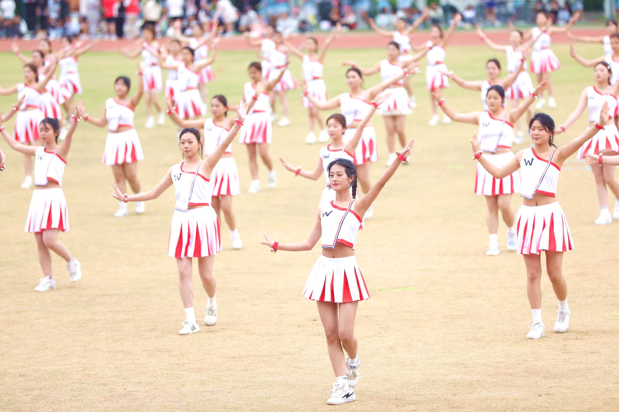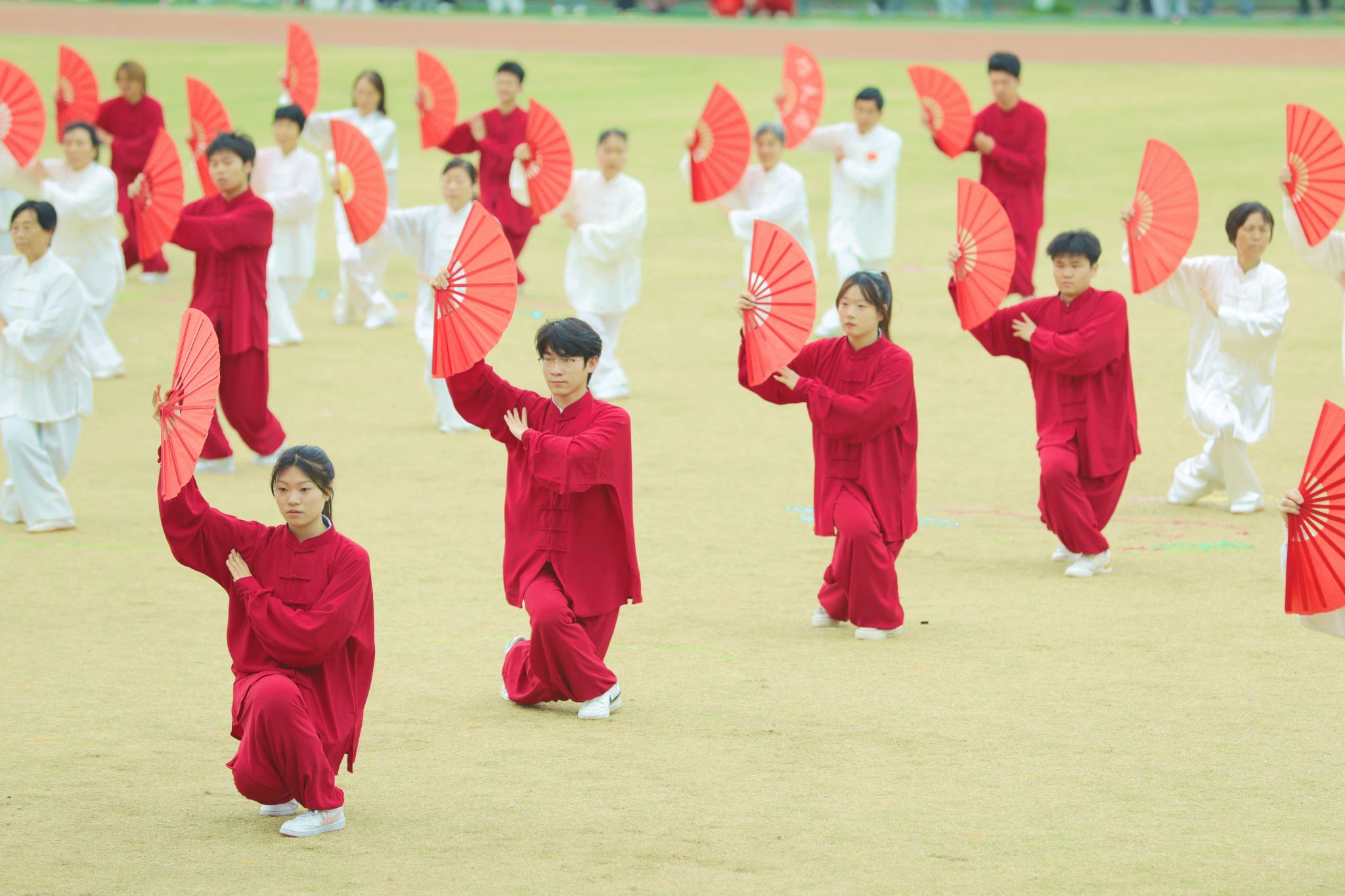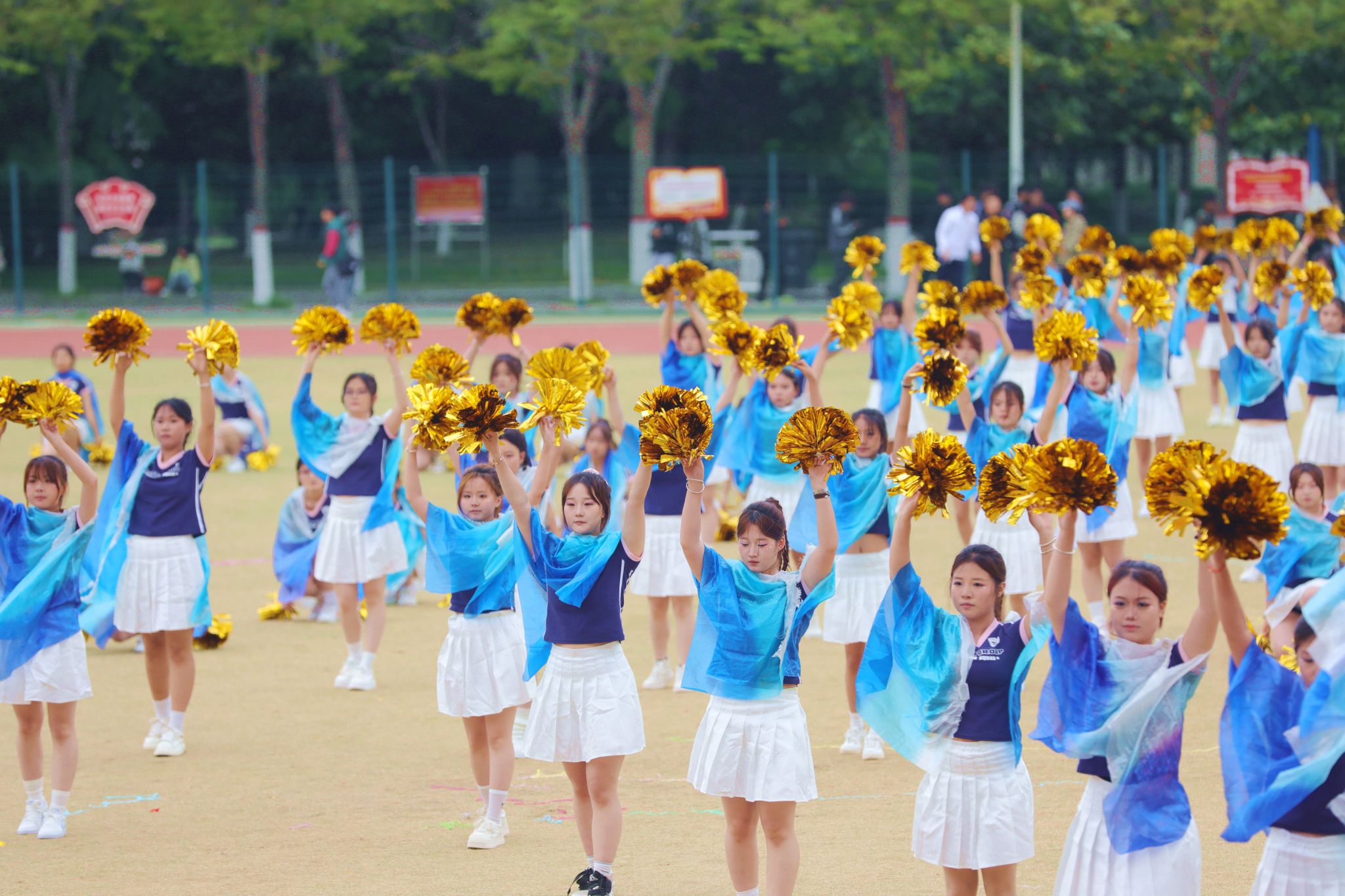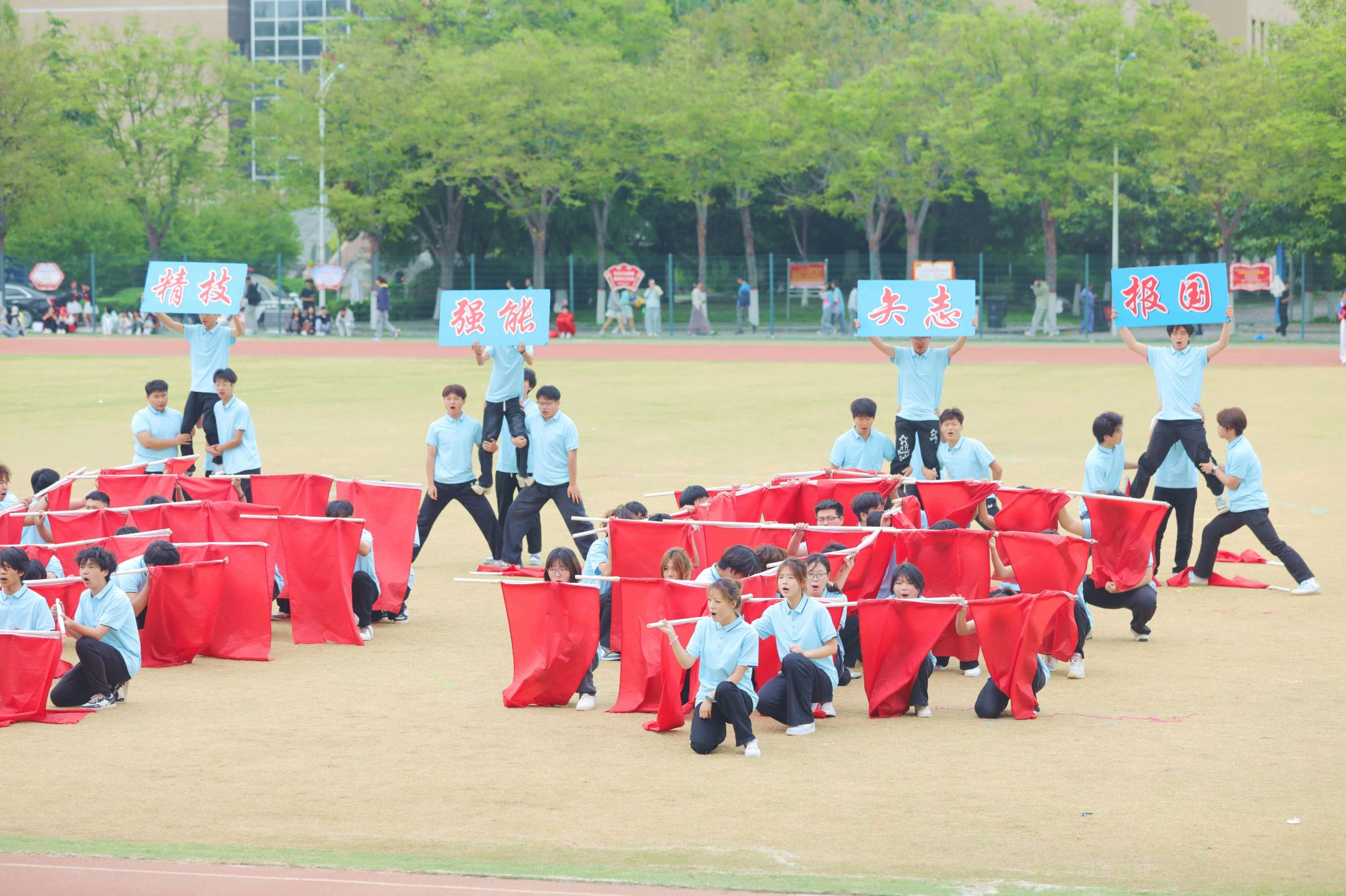 开幕式团体操表演将现场气氛推向顶峰。各学院精心编排的节目轮番登场,科技元素与传统文化的交融成为最大亮点。信息工程学院团体操表演融入了机器人和机器狗的协同演绎,科技感十足的“数字伙伴”与学子们灵动舞姿相映成趣,展现了咸职学子独有的温度与力量。机电学院团体操和着《精忠报国》的激昂旋律,传统京剧国粹与青春活力碰撞,展现中华优秀传统文化的时代风采。师范学院的“欢快小马”方阵与“奔腾骏马”方阵相映成趣,小马灵动可爱,骏马气势如虹,象征着教育事业的薪火相传与蓬勃发展。体育学院与咸阳市太极拳协会合作呈现太极扇展演,扇影灵动间尽显中华传统体育魅力,彰显校企同心、健康同行的时代风采。化工学院团体操队伍如精密仪器般井然有序,建筑工程学院啦啦操用动感舞姿诠释建筑韵律,财经学院团体操以智慧与激情的交响奏响逐梦前行的最美宣言……一个个精彩节目轮番上演,赢得现场师生阵阵喝彩。